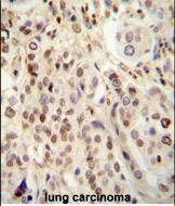 TGM6 antibody (Center) (Cat. #P30903) immunohistochemistry analysis in formalin fixed and paraffin embedded human lung carcinoma followed by peroxidase conjugation of the secondary antibody and DAB staining. This data demonstrates the use of the TGM6 antibody (Center) for immunohistochemistry. Clinical relevance has not been evaluated. |
