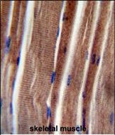 THUM3 Antibody (Center) (Cat. #P30857) immunohistochemistry analysis in formalin fixed and paraffin embedded human skeletal muscle followed by peroxidase conjugation of the secondary antibody and DAB staining. This data demonstrates the use of the THUM3 Antibody (Center) for immunohistochemistry. Clinical relevance has not been evaluated. |