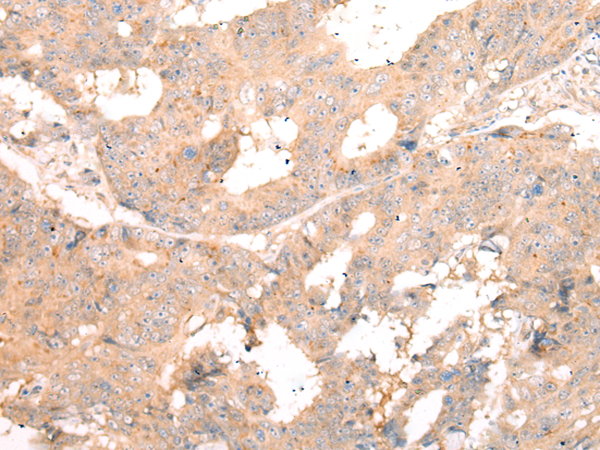 The image is immunohistochemistry of paraffin-embedded Human colorectal cancer tissue using P04299(TLR9 Antibody) at dilution 1/20. (Original magnification: ×200) |