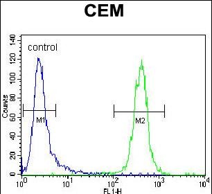 TNF Antibody (C-term) (Cat. #P31304) flow cytometric analysis of CEM cells (right histogram) compared to a negative control cell (left histogram).FITC-conjugated goat-anti-rabbit secondary antibodies were used for the analysis. |