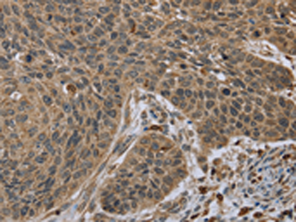 The image is immunohistochemistry of paraffin-embedded Human lung cancer tissue using P05098(TNFRSF13C Antibody) at dilution 1/45. (Original magnification: ×200) |