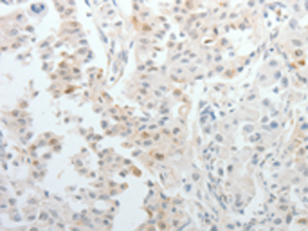 The image is immunohistochemistry of paraffin-embedded Human lung cancer tissue using P11138(TOP1MT Antibody) at dilution 1/10. (Original magnification: ×200) |