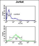 TPC6A Antibody (N-term) (Cat. #P30665) flow cytometric analysis of Jurkat cells (bottom histogram) compared to a negative control cell (top histogram).FITC-conjugated goat-anti-rabbit secondary antibodies were used for the analysis. |