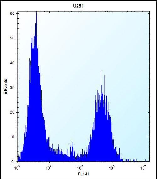 TPM4 Antibody (N-term) (Cat. #P31149) flow cytometric analysis of U251 cells (right histogram) compared to a negative control cell (left histogram).FITC-conjugated goat-anti-rabbit secondary antibodies were used for the analysis. |