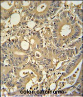 TPSD1 antibody (C-term) (Cat. #P30796) immunohistochemistry analysis in formalin fixed and paraffin embedded human colon carcinoma followed by peroxidase conjugation of the secondary antibody and DAB staining. This data demonstrates the use of the TPSD1 antibody (C-term) for immunohistochemistry. Clinical relevance has not been evaluated. |