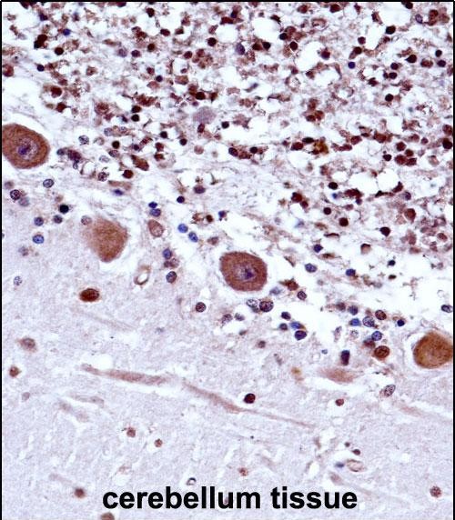 TRA2B Antibody (Center) (P31512)immunohistochemistry analysis in formalin fixed and paraffin embedded human cerebellum tissue followed by peroxidase conjugation of the secondary antibody and DAB staining.This data demonstrates the use of TRA2B Antibody (Center) for immunohistochemistry. Clinical relevance has not been evaluated. |