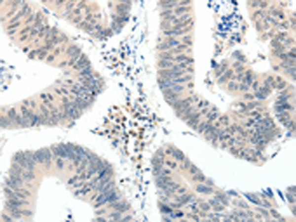 The image is immunohistochemistry of paraffin-embedded Human colon cancer tissue using P04225(TRAF7 Antibody) at dilution 1/20. (Original magnification: ×200) |