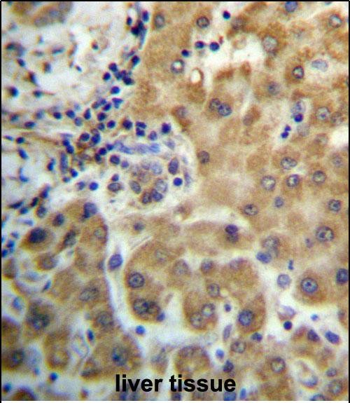 TRIM4 Antibody (N-term) (Cat. #P31256)immunohistochemistry analysis in formalin fixed and paraffin embedded human liver tissue followed by peroxidase conjugation of the secondary antibody and DAB staining.This data demonstrates the use of TRIM4 Antibody (N-term) for immunohistochemistry. Clinical relevance has not been evaluated. |