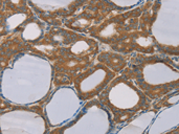 The image is immunohistochemistry of paraffin-embedded Human thyroid cancer tissue using P05233(TRIM40 Antibody) at dilution 1/40. (Original magnification: ×200) |