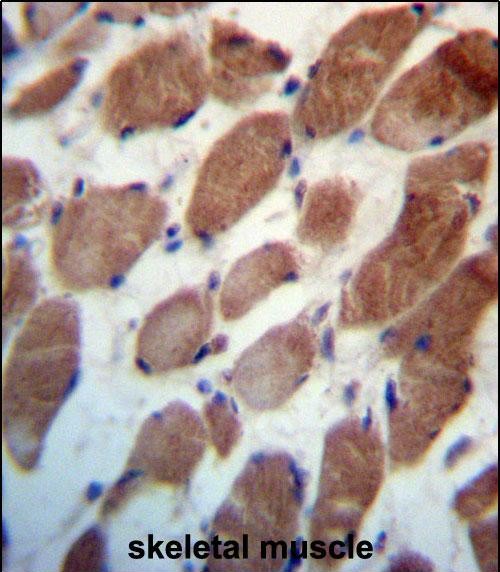 TRIM54 Antibody (N-term) (Cat. #P31257)immunohistochemistry analysis in formalin fixed and paraffin embedded human skeletal muscle followed by peroxidase conjugation of the secondary antibody and DAB staining.This data demonstrates the use of TRIM54 Antibody (N-term) for immunohistochemistry. Clinical relevance has not been evaluated. |