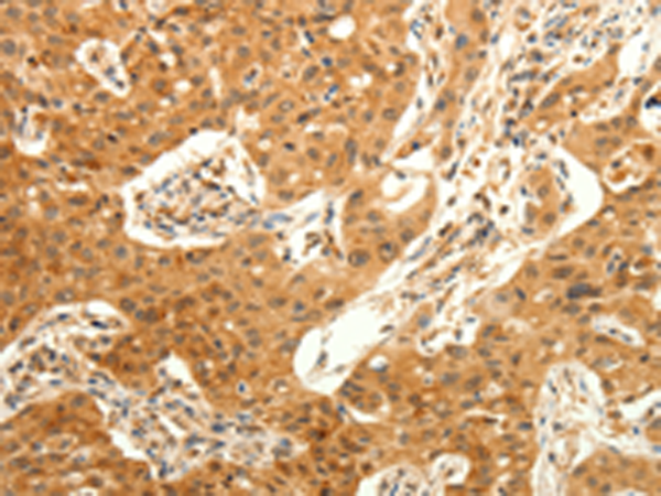The image is immunohistochemistry of paraffin-embedded Human liver cancer tissue using P11395(TRPC6 Antibody) at dilution 1/50. (Original magnification: ×200) |