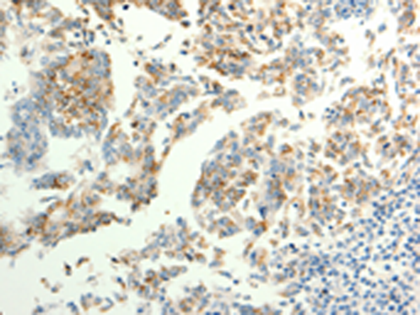 The image is immunohistochemistry of paraffin-embedded Human gastric cancer tissue using P04504(TRPC6 Antibody) at dilution 1/40. (Original magnification: ×200) |