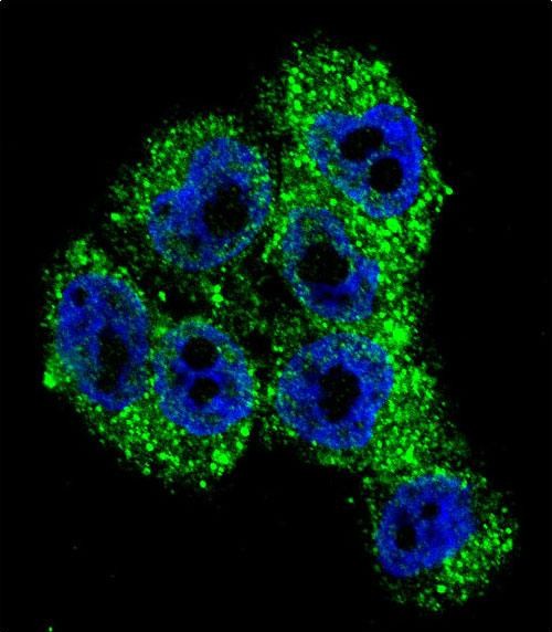 Confocal immunofluorescent analysis of TRPM8 Antibody (Center)(Cat#P32561) with A375 cell followed by Alexa Fluor 488-conjugated goat anti-rabbit lgG (green). DAPI was used to stain the cell nuclear (blue). |