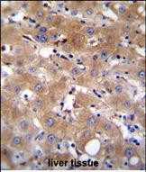 TRPM8 Antibody (Center) (Cat. #P32561)immunohistochemistry analysis in formalin fixed and paraffin embedded human liver tissue followed by peroxidase conjugation of the secondary antibody and DAB staining.This data demonstrates the use of TRPM8 Antibody (Center) for immunohistochemistry. Clinical relevance has not been evaluated. |