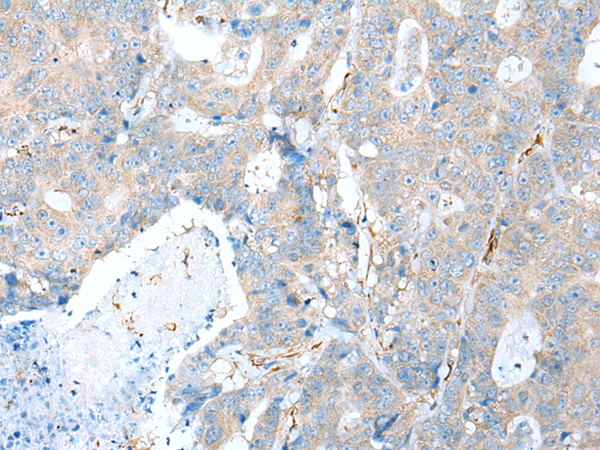 The image is immunohistochemistry of paraffin-embedded Human colorectal cancer tissue using P05676(TRPV6 Antibody) at dilution 1/20. (Original magnification: ×200) |