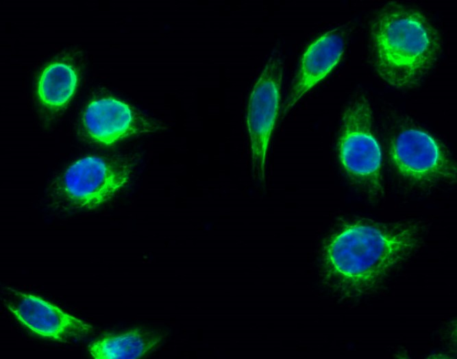 Immunofluorescence analysis of TSG101 in Hela using TGS101 antibody(green) |