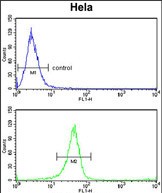 TSPAN6 Antibody (C-term) (Cat. #P30476) flow cytometry analysis of Hela cells (bottom histogram) compared to a negative control cell (top histogram).FITC-conjugated goat-anti-rabbit secondary antibodies were used for the analysis. |
