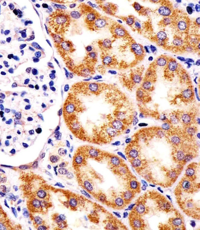 P33332 staining TST in human kidney tissue sections by Immunohistochemistry (IHC-P – paraformaldehyde-fixed, paraffin-embedded sections). Tissue was fixed with formaldehyde and blocked with 3% BSA for 0. 5 hour at room temperature; antigen retrieval was by heat mediation with a citrate buffer (pH6). Samples were incubated with primary antibody (1/25) for 1 hours at 37°C. A undiluted biotinylated goat polyvalent antibody was used as the secondary antibody. |