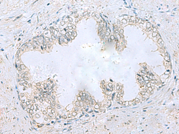 The image is immunohistochemistry of paraffin-embedded Human prostate cancer tissue using P12944(TUBB2A Antibody) at dilution 1/30. (Original magnification: ×200) |