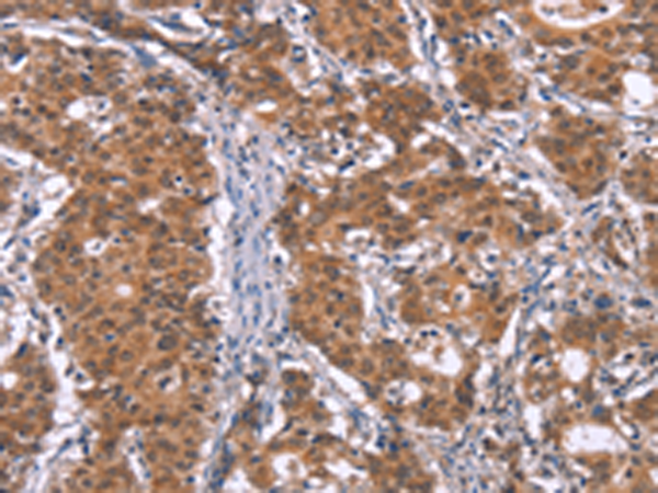 The image is immunohistochemistry of paraffin-embedded Human gastric cancer tissue using P11782(TUBGCP2 Antibody) at dilution 1/15. (Original magnification: ×200) |