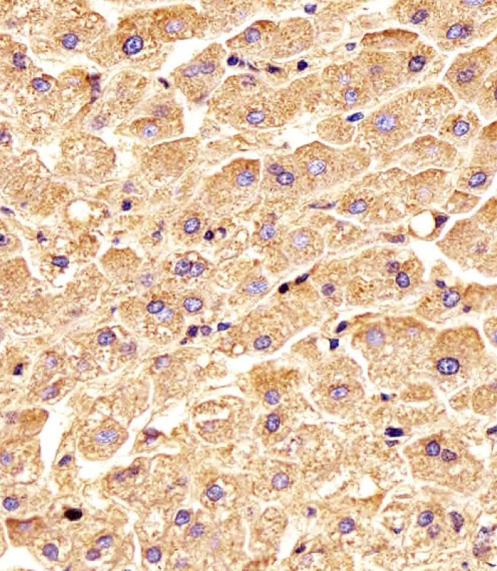 Immunohistochemical analysis of paraffin-embedded H. liver section using TYK2 Antibody (C-term)(Cat#P32834). P32834 was diluted at 1:25 dilution. A undiluted biotinylated goat polyvalent antibody was used as the secondary, followed by DAB staining. |