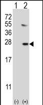 Western blot analysis of UBE2G1 (arrow) using rabbit polyclonal UBE2G1 Antibody (R11) (Cat.#P30064). 293 cell lysates (2 ug/lane) either nontransfected (Lane 1) or transiently transfected (Lane 2) with the UBE2G1 gene. |