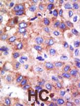 Formalin-fixed and paraffin-embedded human cancer tissue reacted with the primary antibody, which was peroxidase-conjugated to the secondary antibody, followed by DAB staining. This data demonstrates the use of this antibody for immunohistochemistry; clinical relevance has not been evaluated. BC = breast carcinoma; HC = hepatocarcinoma. |