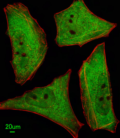Immunofluorescent analysis of Hela cells, using Ubiquilin1 Antibody (Center) (Cat. #P30070). P30070 was diluted at 1:100 dilution. Alexa Fluor 488-conjugated goat anti-rabbit lgG at 1:400 dilution was used as the secondary antibody (green). Cytoplasmic actin was counterstained with Dylight Fluor® 554 (red) conjugated Phalloidin (red). |
