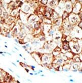 Formalin-fixed and paraffin-embedded human cancer tissue reacted with the primary antibody, which was peroxidase-conjugated to the secondary antibody, followed by AEC staining. This data demonstrates the use of this antibody for immunohistochemistry; clinical relevance has not been evaluated. BC = breast carcinoma; HC = hepatocarcinoma. |