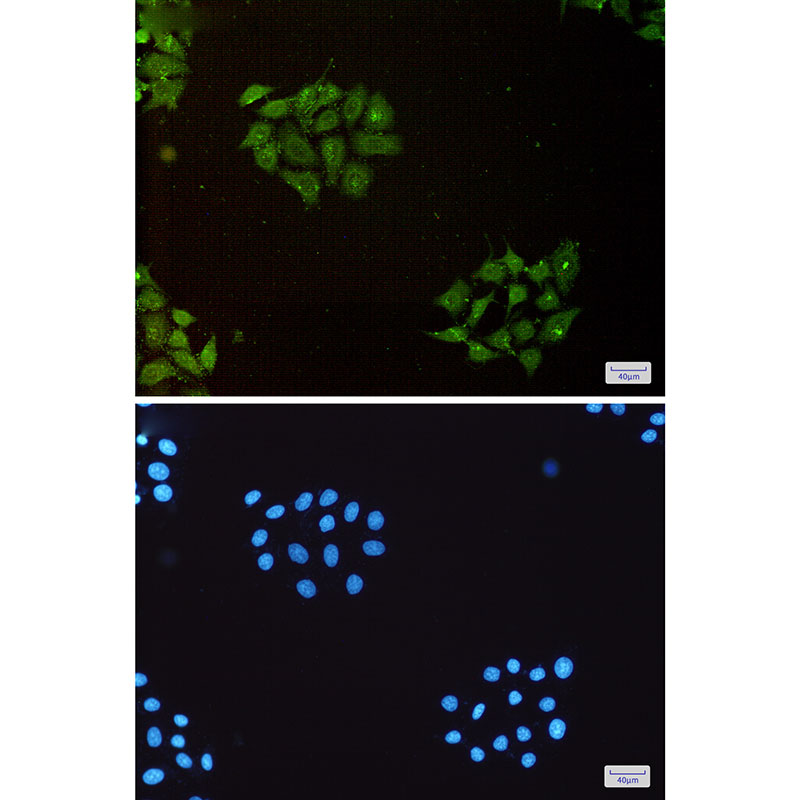 Immunocytochemistry analysis of UBA52(green) in Hela using UBA52 antibody,and DAPI(blue) |