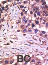 Formalin-fixed and paraffin-embedded human cancer tissue reacted with the primary antibody, which was peroxidase-conjugated to the secondary antibody, followed by AEC staining. This data demonstrates the use of this antibody for immunohistochemistry; clinical relevance has not been evaluated. BC = breast carcinoma; HC = hepatocarcinoma. |