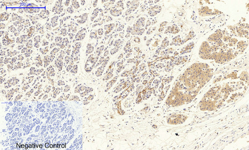 Immunohistochemistry analysis of paraffin-embedded Human stomach cancer using Flk1 antibody. High-pressure and temperature Sodium Citrate pH 6.0 was used for antigen retrieval.Negative control was used by secondary antibody only. |