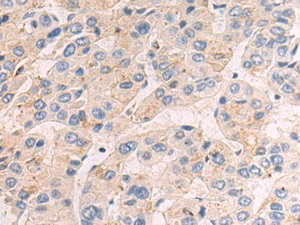 The image is immunohistochemistry of paraffin-embedded Human liver cancer tissue using P11150(VEGFA Antibody) at dilution 1/50. (Original magnification: ×200) |