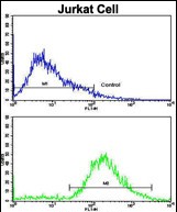 Flow cytometric analysis of jurkat cells using VIP Antibody (C-term)(bottom histogram) compared to a negative control cell (top histogram). FITC-conjugated goat-anti-rabbit secondary antibodies were used for the analysis. |