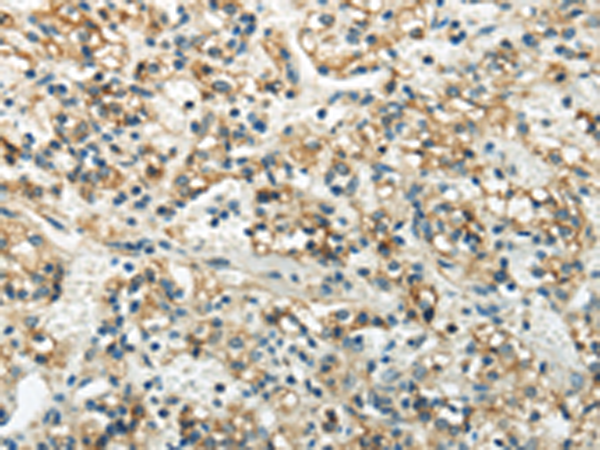The image is immunohistochemistry of paraffin-embedded Human thyroid cancer tissue using P05539(WNK3 Antibody) at dilution 1/20. (Original magnification: ×200) |