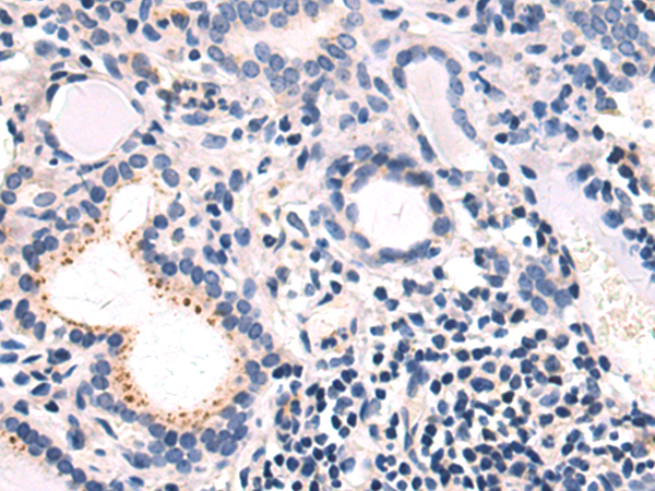 The image is immunohistochemistry of paraffin-embedded Human thyroid cancer tissue using P13817(YOD1 Antibody) at dilution 1/50. (Original magnification: ×200) |