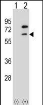 Western blot analysis of ZBTB7B (arrow) using rabbit polyclonal ZBTB7B Antibody (Center) (Cat. #P31725). 293 cell lysates (2 ug/lane) either nontransfected (Lane 1) or transiently transfected (Lane 2) with the ZBTB7B gene. |