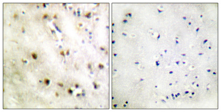 Immunohistochemistry analysis of paraffin-embedded Human brain using ZFP36L1 antibody.High-pressure and temperature Tris-EDTA pH 8.0 was used for antigen retrieval. Sample with blocking peptide on the right. |