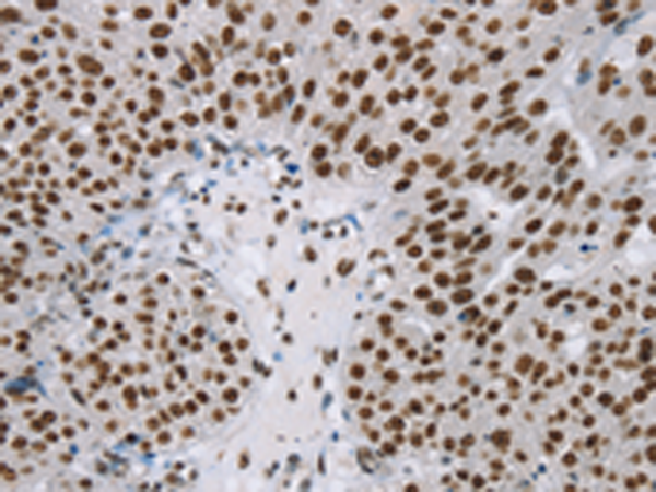 The image is immunohistochemistry of paraffin-embedded Human breast cancer tissue using P12104(ZMIZ1 Antibody) at dilution 1/20. (Original magnification: ×200) |