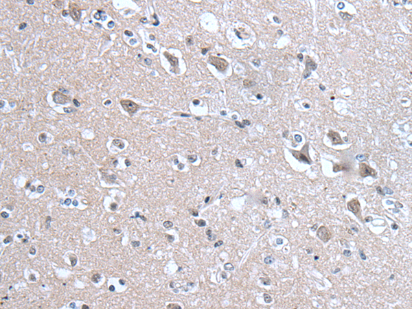 The image is immunohistochemistry of paraffin-embedded Human brain tissue using P12841(ZNF143 Antibody) at dilution 1/20. (Original magnification: ×200) |