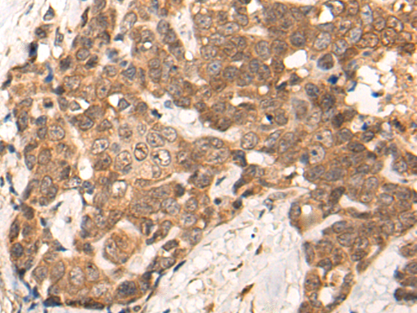 The image is immunohistochemistry of paraffin-embedded Human ovarian cancer tissue using P11502(ZNF467 Antibody) at dilution 1/30. (Original magnification: ×200) |