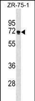 ZNF654 Antibody (C-term) (Cat. #P32269) western blot analysis in ZR-75-1 cell line lysates (35ug/lane).This demonstrates the ZNF654 antibody detected the ZNF654 protein (arrow). |